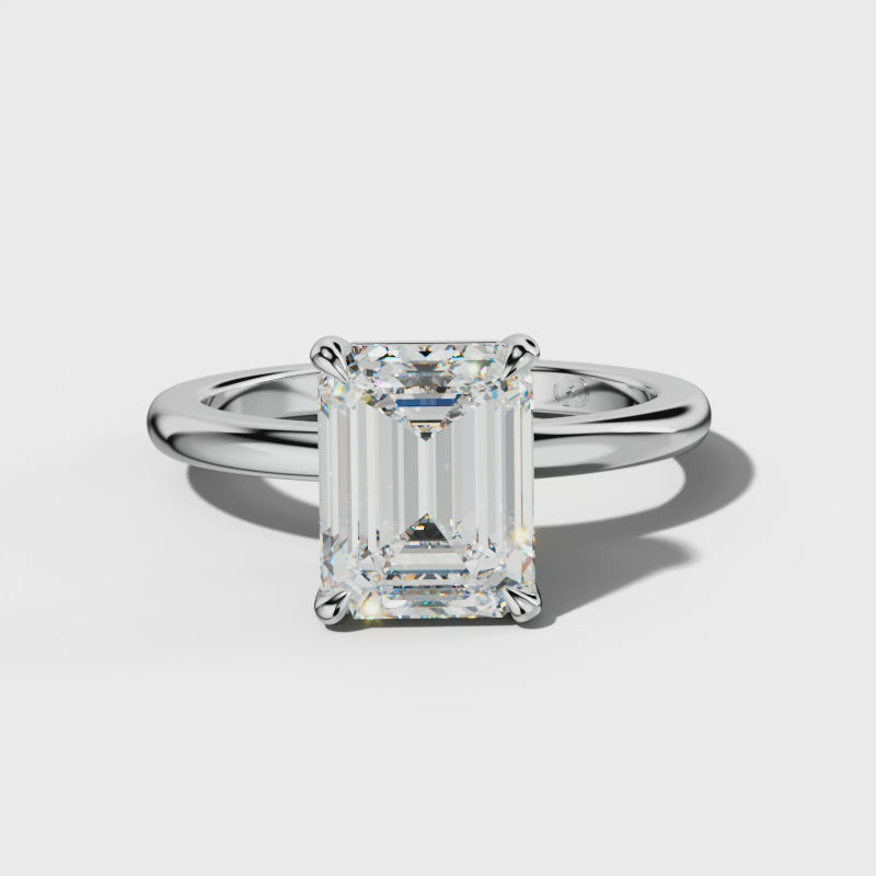 The Alice Emerald Cut Engagement Ring features a classic solitaire design, showcasing a stunning emerald-cut diamond held securely by four claw prongs. This setting maximizes the diamond’s brilliance while emphasizing its elegant rectangular shape, ideal for those seeking timeless sophistication and refined craftsmanship in an engagement ring.