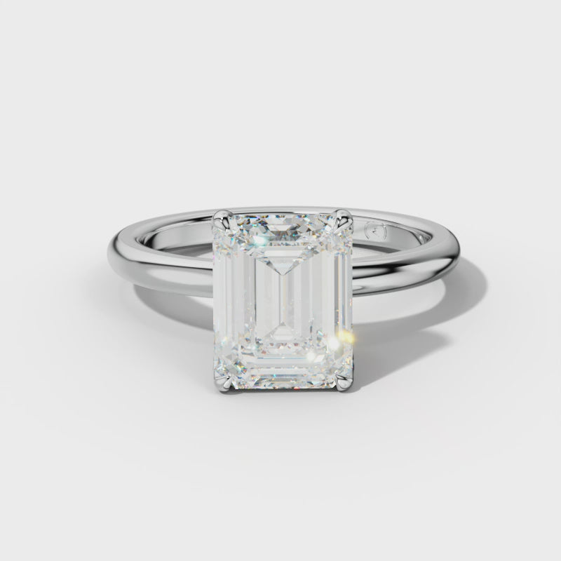 The Anna Engagement Ring showcases a striking emerald-cut diamond, elegantly framed by pave-set stones underneath the band. This expert design maximizes brilliance and adds subtle sparkle from every angle, offering a sophisticated and timeless choice for those seeking refined elegance in their engagement ring.