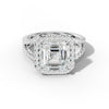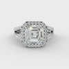 The Ariel Asscher Diamond Engagement Ring features a sophisticated halo design that enhances the brilliance of the central Asscher-cut diamond. Securely held in a classic four-prong setting, this ring offers both elegance and durability. Its pave-set band adds extra sparkle, creating a timeless piece that expertly balances refined craftsmanship with exceptional brilliance.