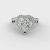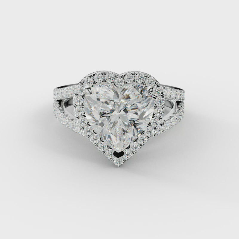 The Ariel Heart Diamond Engagement Ring features a stunning heart-shaped center diamond, expertly showcased in a secure prong setting. Surrounding the centerpiece, a delicate halo of pave-set diamonds enhances its brilliance and adds sophisticated sparkle. This design combines classic elegance with intricate detailing, creating an engagement ring that is both timeless and captivating.