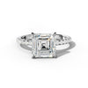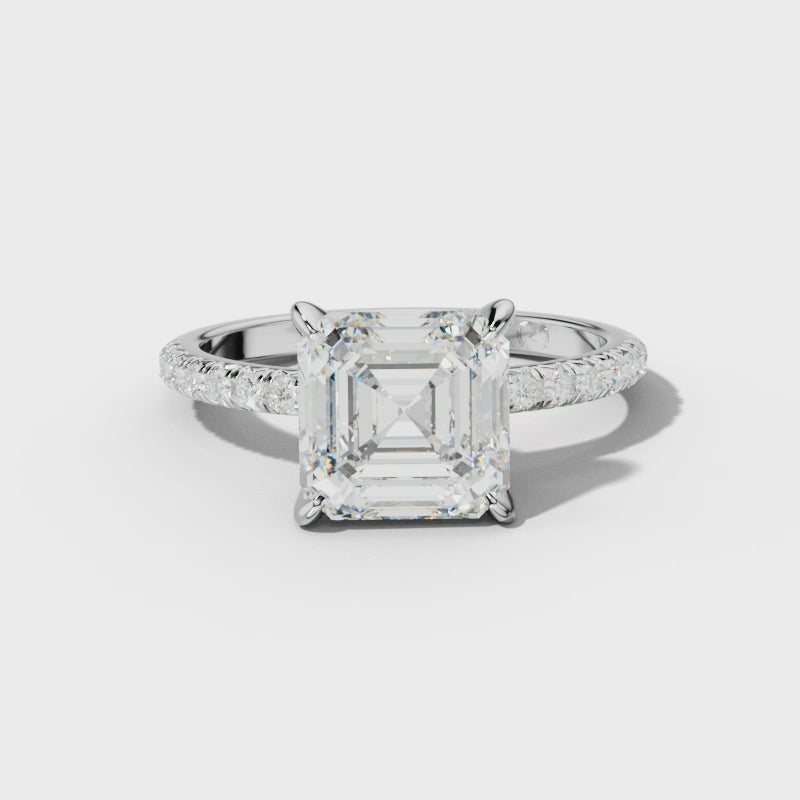 The Audrey Engagement Ring is expertly crafted to showcase a striking Asscher cut diamond, celebrated for its geometric elegance and clarity. The four-prong setting ensures maximum security while allowing light to enhance the diamond’s brilliance. French pave side stones delicately frame the center, adding refined sparkle and sophistication.