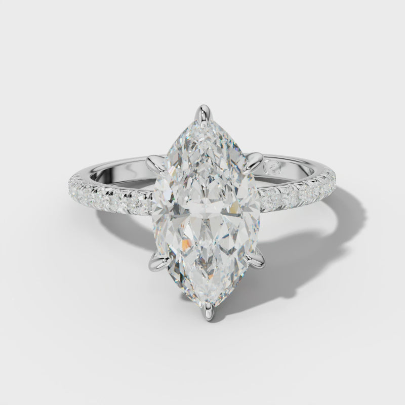 The Audrey Engagement Ring features a stunning marquise-cut diamond centerpiece, expertly set to emphasize its elegant shape and brilliance. Flanked by French pave side stones, this ring offers timeless sophistication and extra sparkle, enhancing the overall allure. Designed for those who appreciate refined craftsmanship and classic beauty, it makes a perfect symbol of enduring commitment.