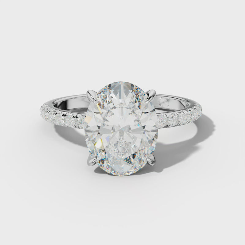 The Audrey Engagement Ring features a stunning oval-cut center diamond, expertly set to enhance brilliance and elegance. Accented with delicate French pave side stones, this ring offers a refined sparkle that complements the central gem beautifully. Designed for timeless sophistication, its meticulous craftsmanship ensures durability and a luxurious finish ideal for celebrating your lifelong commitment.