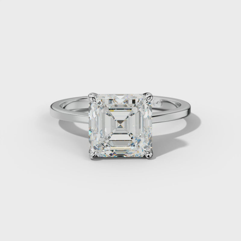 The Camila Engagement Ring features a meticulously crafted four-prong setting that secures the distinctive Asscher-cut diamond, emphasizing its exceptional clarity and geometric elegance. Designed to showcase brilliance from every angle, this ring combines timeless sophistication with expert craftsmanship, making it an ideal symbol of enduring commitment.