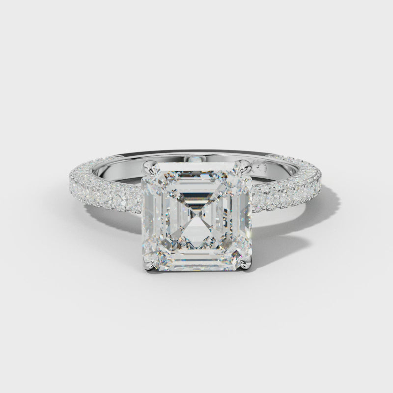 The Caroline Engagement Ring showcases a timeless solitaire design with a distinctive Asscher cut center stone, renowned for its brilliance and geometric elegance. Enhanced by three rows of pave-set side stones, this ring offers exceptional sparkle and refined detail. Expertly crafted to highlight the center diamond’s clarity and depth, it’s a sophisticated choice for those seeking classic style with contemporary flair.