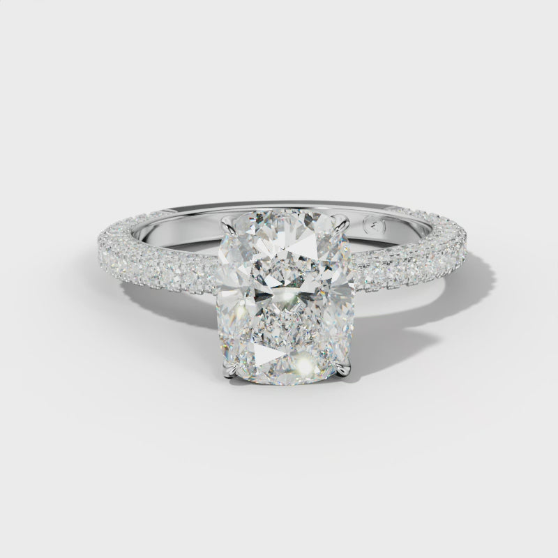 The Caroline Engagement Ring showcases a striking solitaire diamond set with a prong setting, emphasizing brilliance and clarity. Its elongated cushion cut enhances finger elegance while maximizing sparkle. Flanked by three rows of pave-set side stones, this ring offers refined sophistication and timeless luxury, perfect for symbolizing lasting commitment.
