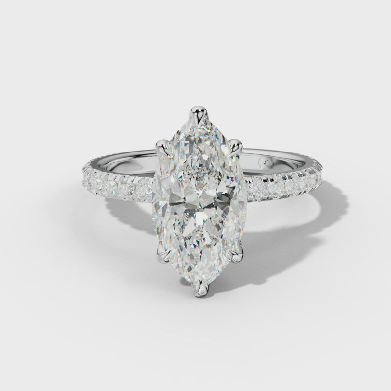 The Juliet Engagement Ring features a stunning marquise-cut center stone set in a delicate pavé setting that amplifies its brilliance. This expertly designed ring includes a hidden halo and side stones positioned beneath the main stones, adding subtle depth and extraordinary sparkle. Combining timeless elegance with intricate craftsmanship, it offers a sophisticated and unique expression of commitment.