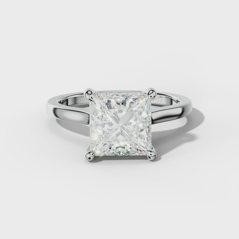 The Lilly Princess Cut Engagement Ring features a brilliant princess-cut center stone elegantly secured by a classic four-prong setting, enhancing its sparkle and durability. Its hidden halo design adds a subtle yet sophisticated layer of brilliance, creating a timeless look that complements any bride’s style with expert craftsmanship.