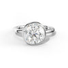 The Malaya Round Diamond Engagement Ring showcases a stunning round diamond in a sophisticated bezel setting, where the stone is surrounded by a metal rim that holds it securely while creating a modern, streamlined silhouette. This solitaire design emphasizes the diamond's brilliance and allows maximum light to enter the stone, enhancing its sparkle and fire.