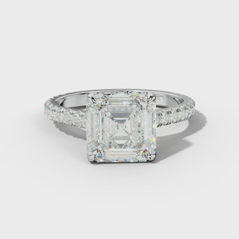 The Stella Engagement Ring features a timeless Asscher-cut center stone, expertly showcased to enhance its brilliance and clarity. A hidden halo delicately encircles the center gem, adding subtle sparkle without overwhelming the design. Accent stones along the band provide additional shimmer, creating an elegant and sophisticated look. This ring blends classic geometry with modern detailing for a refined symbol of everlasting commitment.