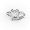 This Charlotte Emerald Cut Diamond Engagement Ring features a stunning emerald cut center stone, complemented with round stones on the sides and underneath in a classic 4-prong setting. Experience timeless beauty and elegance with this exquisite diamond ring.
