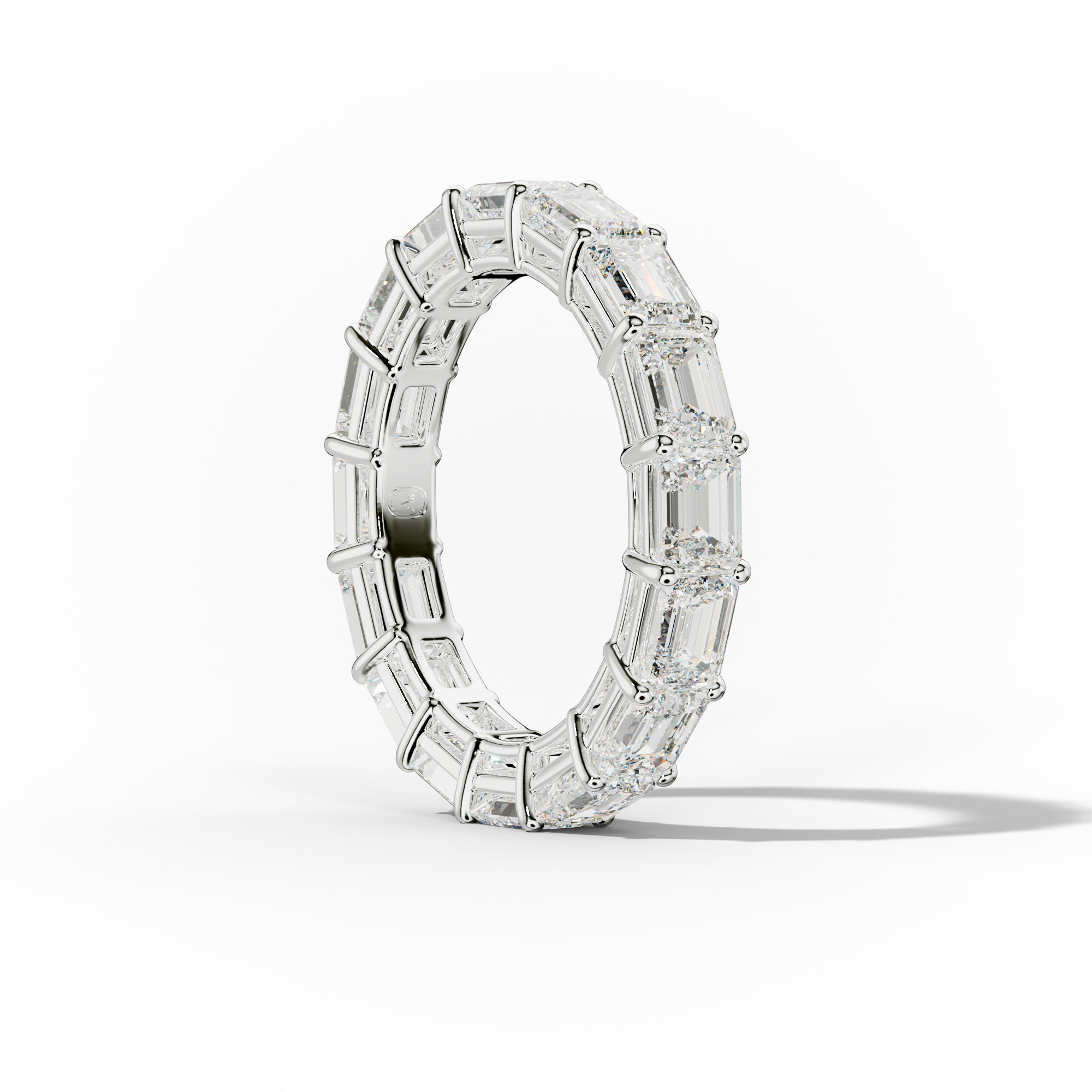This 4.0 carat East West Emerald Cut Diamond Eternity Band features a shared prong design, showcasing the stunning emerald cut diamonds. With a 4.0 carat weight, this band offers a timeless and elegant touch to any attire. Expertly crafted, it serves as a true representation of luxury and sophistication.