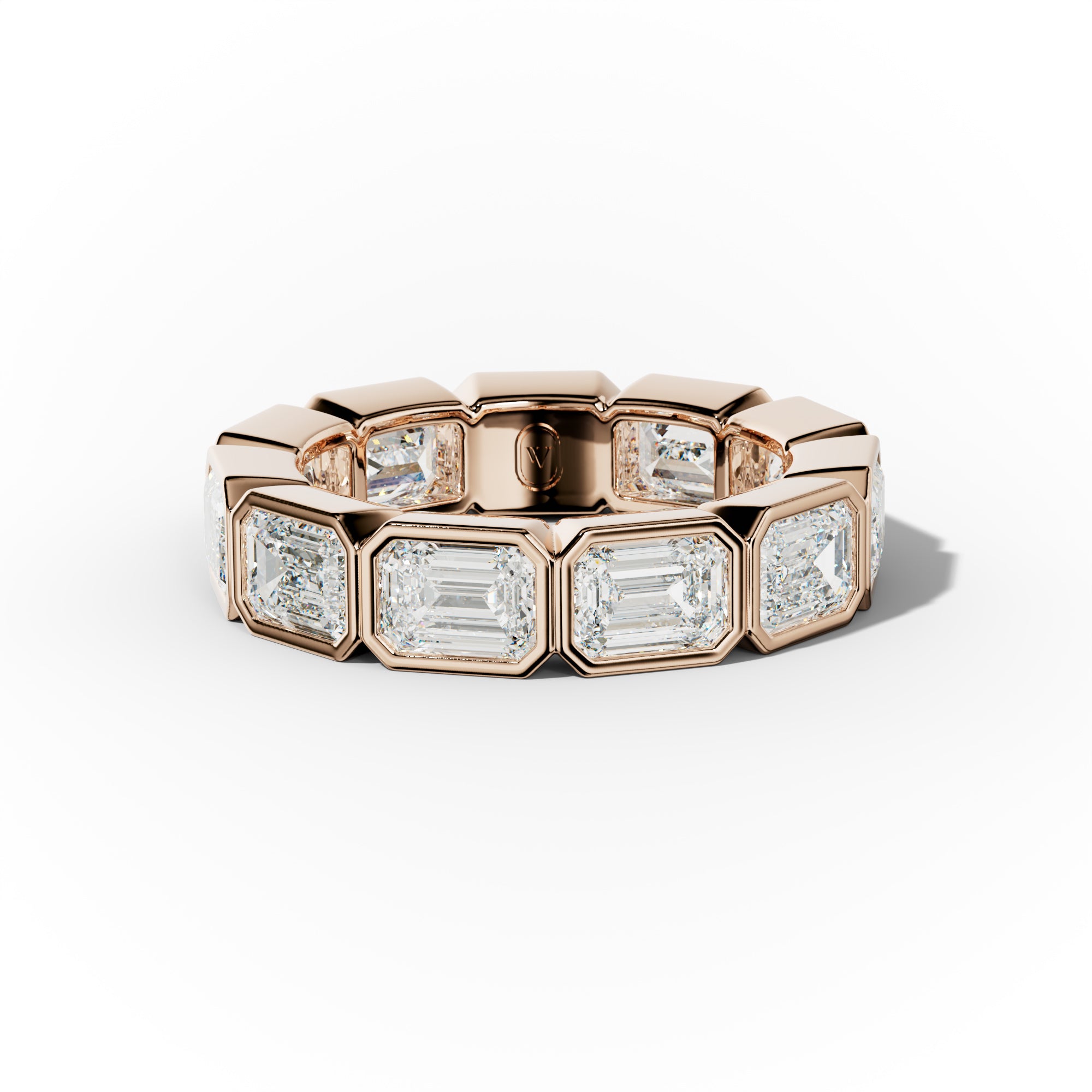 This 5.0 carat emerald cut diamond eternity band features a unique east-west setting for a modern twist on a classic style. The bezel setting not only adds a contemporary touch, but also provides added security for the diamonds. With a total weight of 5.0 carats, this band is sure to make a stunning statement.