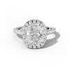 The Madison Elongated Cushion Cut Engagement Ring features a stunning French pavé halo that enhances the central elongated cushion cut diamond with intricate sparkle. Delicate sidestones and complementary stones placed beneath the main setting add depth and brilliance, creating an expert-level design that balances elegance and sophistication. This ring exemplifies refined craftsmanship focused on maximizing light and visual appeal.