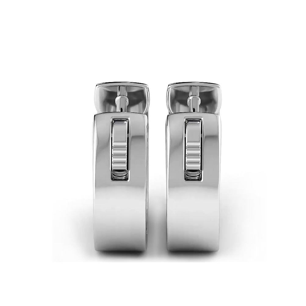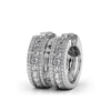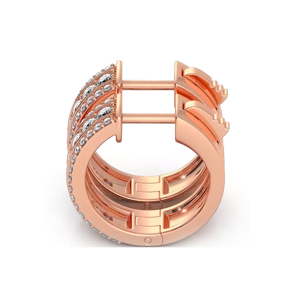 Featuring three rows of round diamonds, with larger diamonds in the center and smaller diamonds on the sides, these huggie style earrings add a touch of elegance and sophistication to any outfit. Elevate your style with these dazzling earrings.
