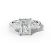 The Hannah Classic Three Stone Engagement Ring features a radiant cut diamond center stone, elegantly accented by pear-shaped side stones. This expertly designed ring highlights the exceptional brilliance and fire of each gem, combining timeless elegance with a modern silhouette. The three-stone arrangement symbolizes past, present, and future, making it a meaningful and refined choice for an engagement ring.