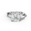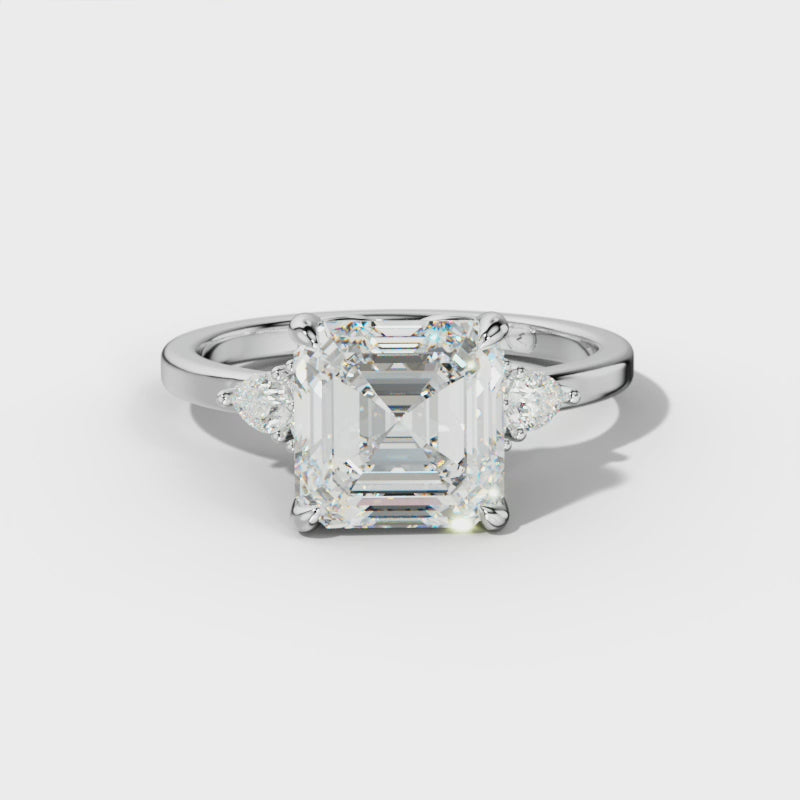 The Sienna Asscher Cut Engagement Ring showcases a meticulously crafted Asscher cut center stone nestled in a distinctive tulip basket setting. Accentuated by pear and round side stones, this ring combines architectural elegance with delicate detailing, offering exceptional brilliance and a refined silhouette ideal for the discerning wearer.