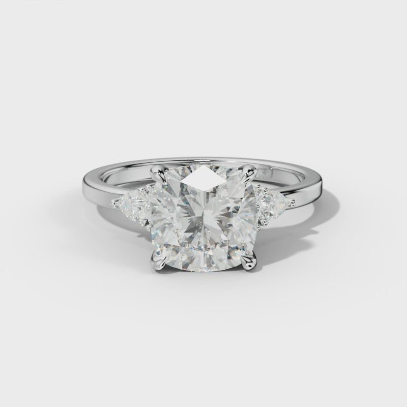 The Sienna Engagement Ring combines timeless elegance with expert craftsmanship. Featuring a radiant cushion-cut center stone, this ring is beautifully accented by pear and round side stones, enhancing its brilliance and depth. Its refined design showcases a perfect balance between classic sophistication and contemporary style, making it an exceptional choice for those seeking a distinctive and luxurious engagement ring.