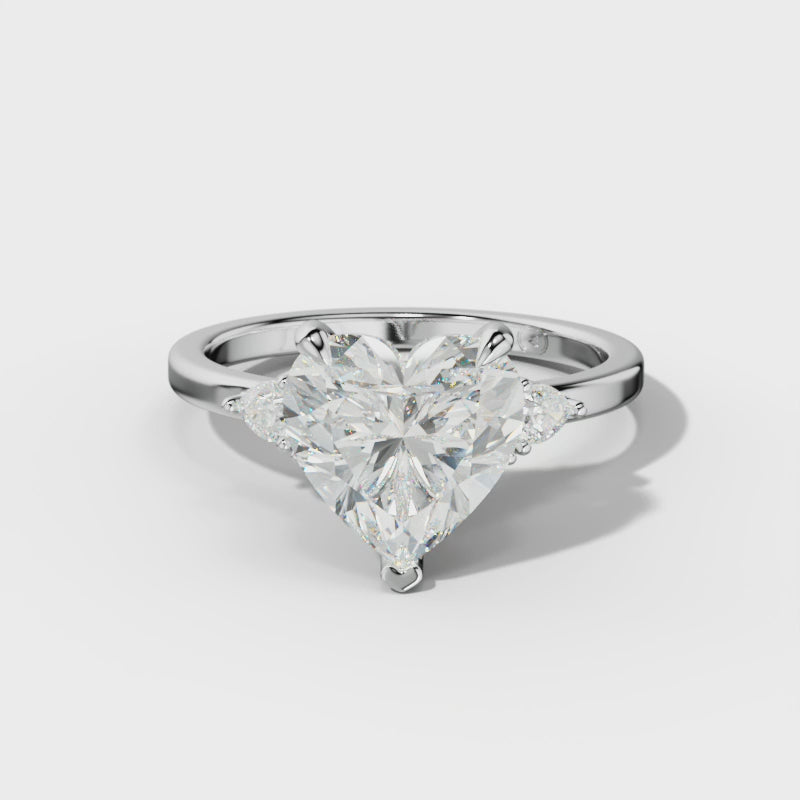 The Sienna Heart Cut Engagement Ring features a captivating heart-shaped center stone, symbolizing love with exceptional brilliance. Elegantly framed by pear and round side stones, this ring achieves a harmonious balance of sophistication and sparkle. Set within a refined tulip basket, the design highlights expert craftsmanship while ensuring durability and comfort for everyday wear.
