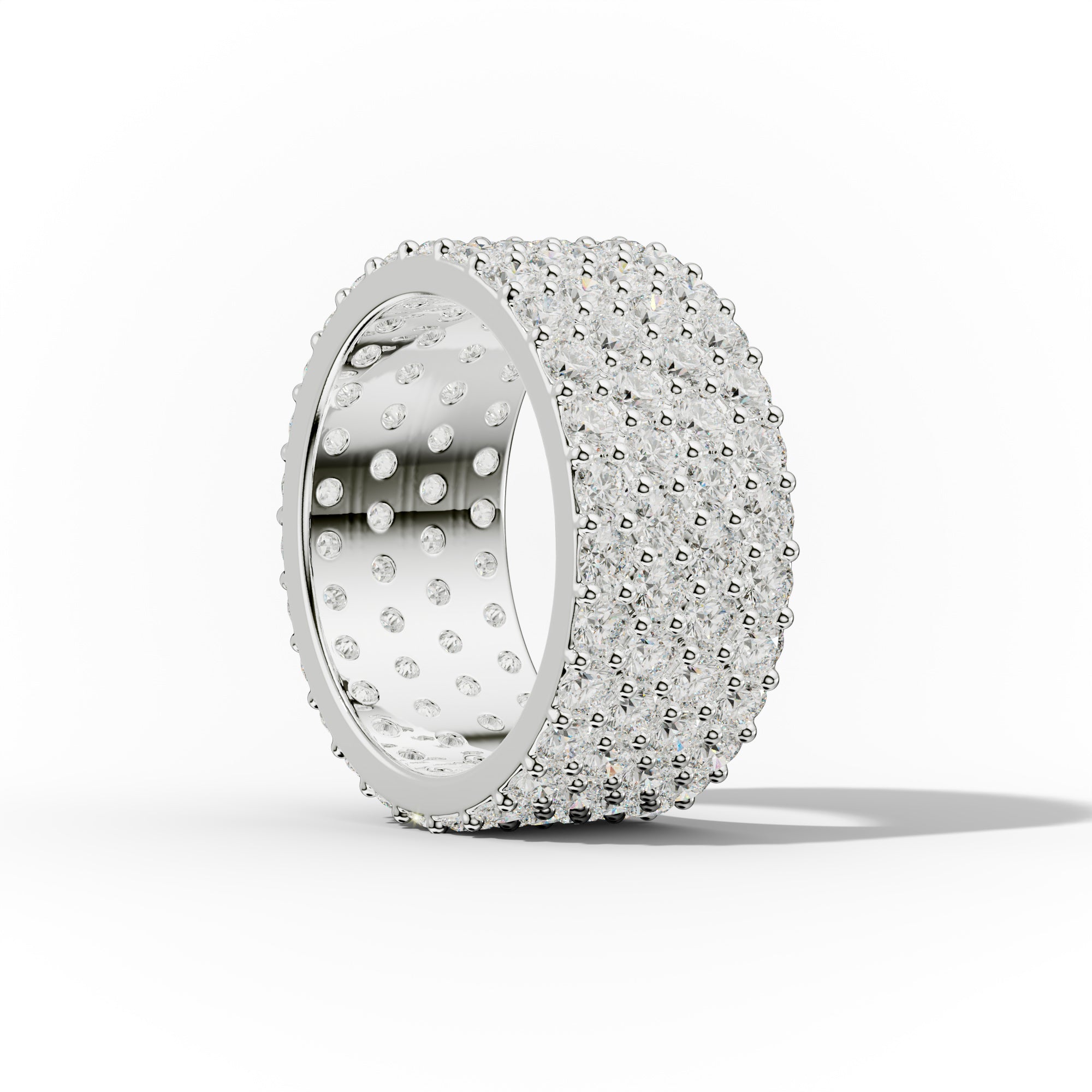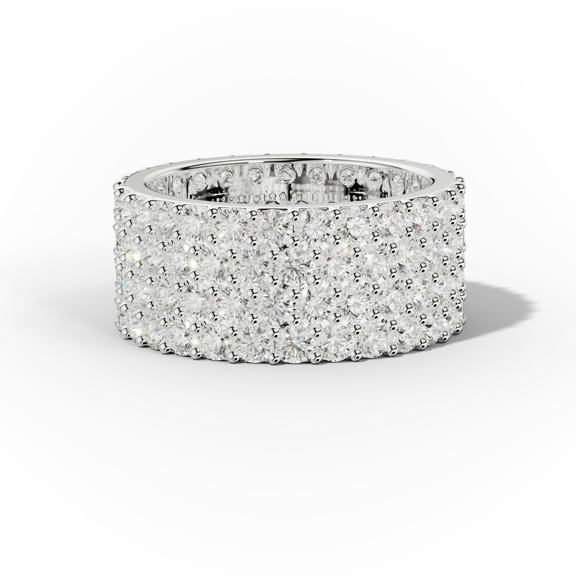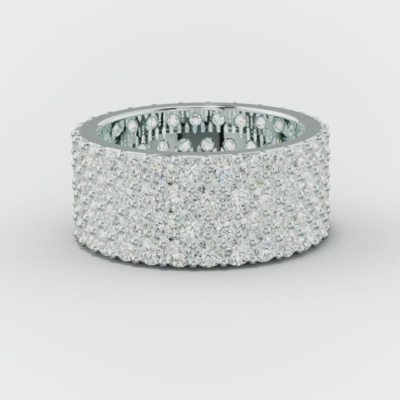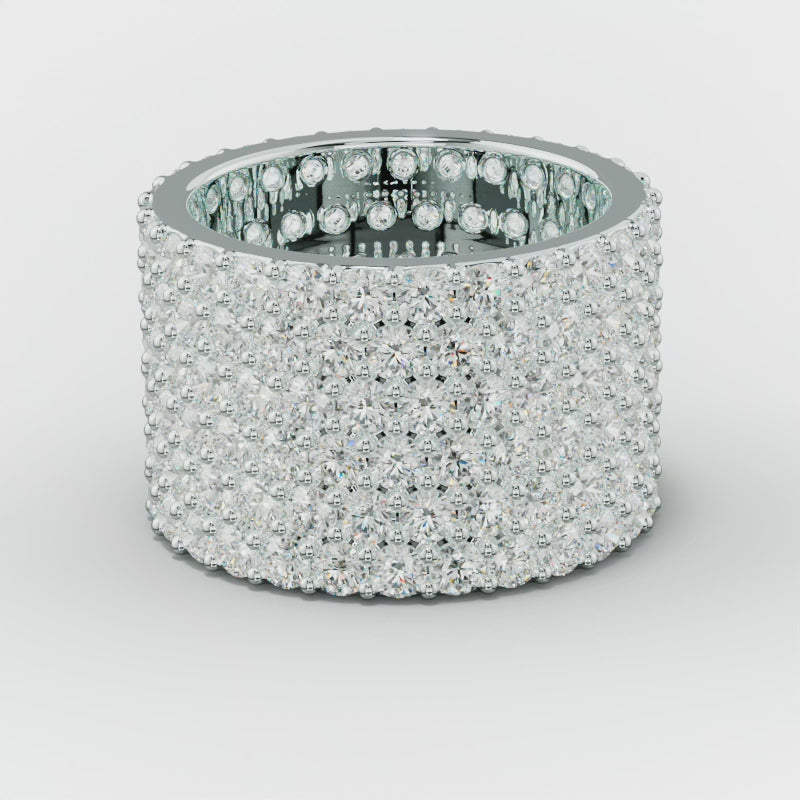 Wide diamond anniversary bands are rings with a broader band and an array of diamonds, providing a striking and luxurious look.