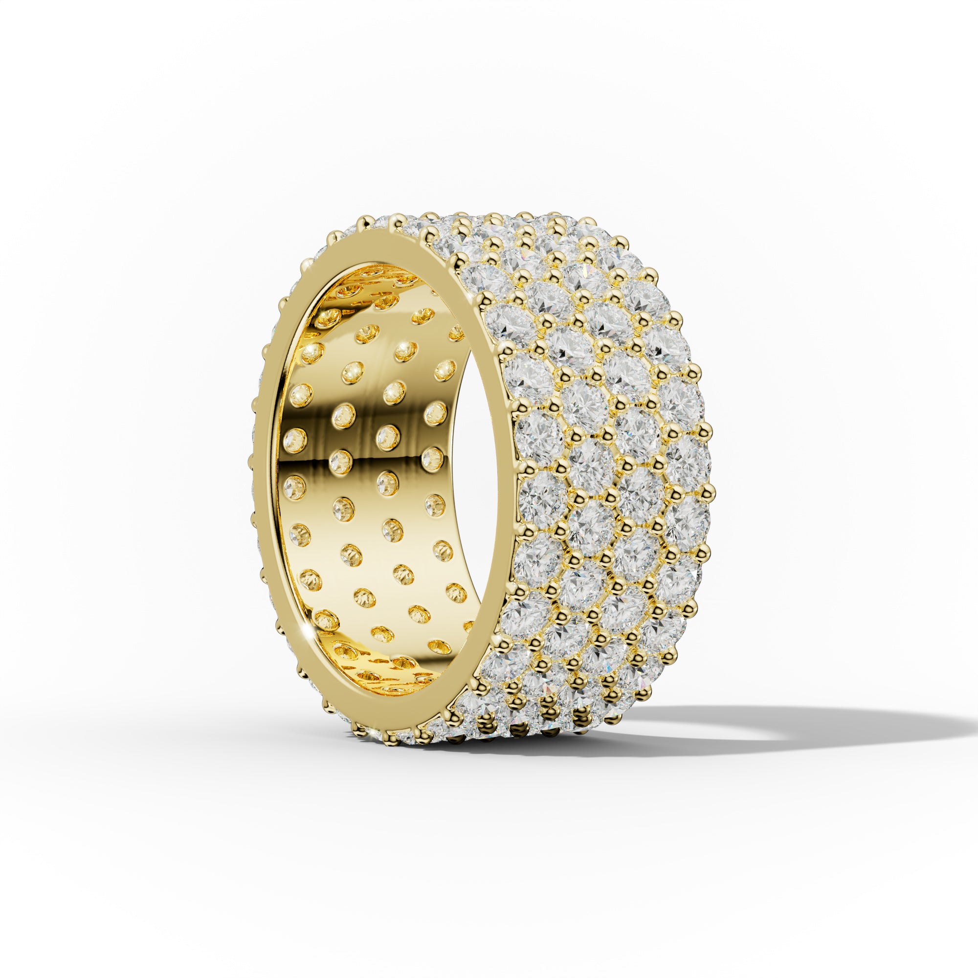 - Shared Prong Setting – Diamonds share prongs for a seamless appearance.