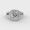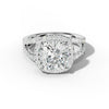 The Ariel Cushion Diamond Engagement Ring features a stunning cushion-cut diamond framed by a halo of pave-set diamonds, enhancing its brilliance and presence. Its secure four-prong setting optimizes light exposure for maximum sparkle, combining expert craftsmanship with timeless design for an elegant and enduring symbol of love.
