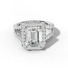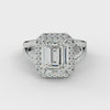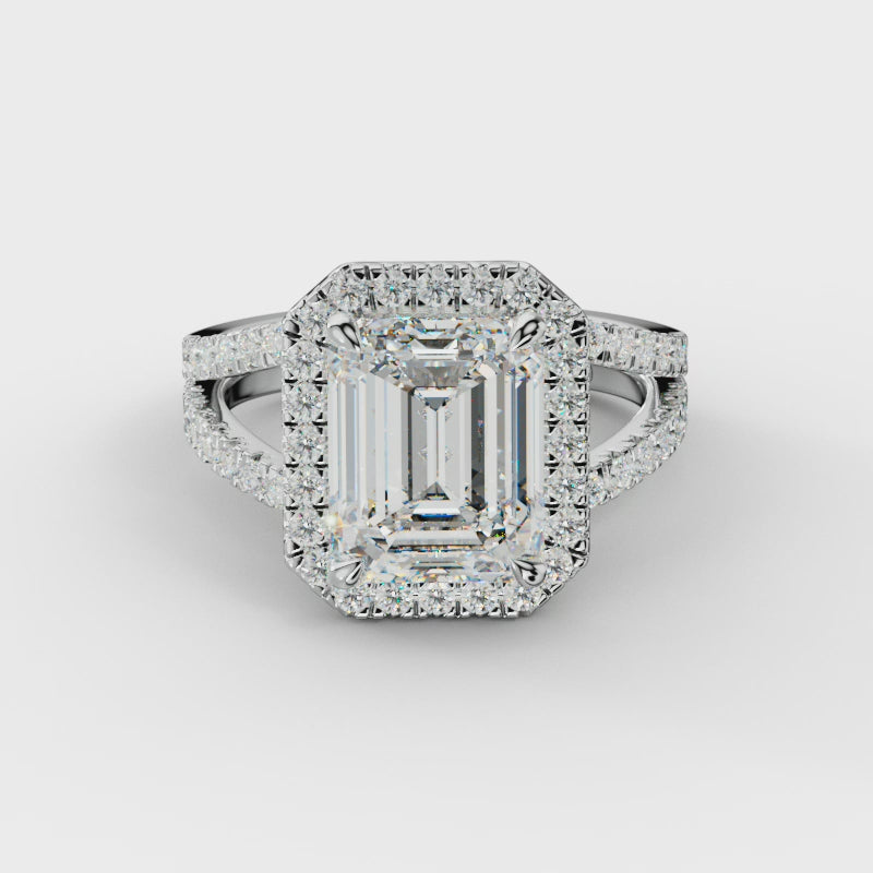 The Ariel Emerald Cut Engagement Ring features a striking emerald-cut center stone, accentuated by a sophisticated halo for enhanced brilliance. Its four-prong setting ensures secure and elegant placement, while the pave setting on the band adds subtle sparkle, creating a timeless and refined statement piece ideal for those seeking classic elegance with a modern touch.