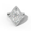 The Ariel Marquise Diamond Engagement Ring showcases a marquise-cut diamond elegantly framed by a halo of pave-set diamonds, enhancing its brilliance and visual impact. The prong setting secures the center stone while maximizing light exposure for exceptional sparkle. This combination of halo and pave detailing delivers refined sophistication and exemplary craftsmanship, making it an ideal choice for those seeking a distinctive and timeless engagement ring.