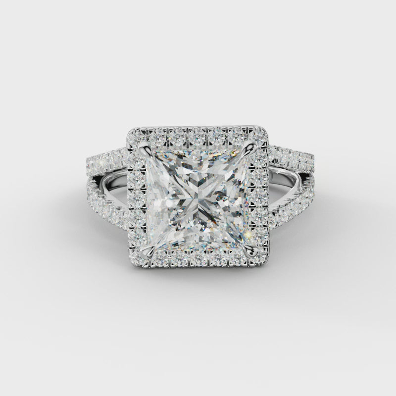 The Ariel Princess Cut Engagement Ring features a stunning princess-cut center stone showcased within a delicate halo, enhancing its brilliance and presence. Its secure four-prong setting ensures durability while allowing maximum light reflection. Surrounding the band, the pave setting adds exquisite sparkle with meticulously placed smaller diamonds, creating a timeless and elegant design perfect for symbolizing a lifelong commitment.
