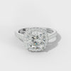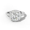 The Aspen Engagement Ring showcases a stunning cushion-cut center stone elevated in a cathedral setting that draws the eye upward with architectural elegance. The U-prong halo design encircles your diamond with a brilliant frame of accent stones, amplifying sparkle and perceived size. Complementary side stones add balanced radiance along the band.