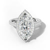 The Aspen Engagement Ring showcases an elegant elongated marquise diamond as its centerpiece, complemented by a sophisticated cathedral setting that adds architectural depth and dimension. The U-prong halo design encircles the center stone with a delicate frame of accent diamonds, enhancing brilliance while creating a flattering optical illusion of increased size. Side stones positioned along the band provide additional sparkle and visual balance, while the cathedral band structure offers timeless appeal and structural integrity.