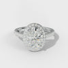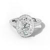 The Aspen Engagement Ring showcases a stunning oval-cut diamond elevated by a cathedral setting that emphasizes vertical elegance. The U-prong halo design encircles the center stone with brilliant accent diamonds, amplifying sparkle and perceived size while providing additional security. Complementary side stones enhance the overall design, creating a sophisticated three-stone aesthetic.