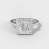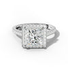 The Aspen Engagement Ring showcases a striking princess-cut diamond at its heart, elevated by an expertly crafted U-prong halo that maximizes brilliance and visual impact. Flanking side stones enhance the overall composition with balanced symmetry and additional sparkle. The U-prong setting provides exceptional security while preserving the ring's refined, open architecture.