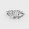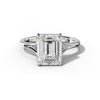 The Azari Emerald Cut Engagement Ring showcases timeless elegance with its distinctive rectangular faceting that maximizes brilliance and clarity. This solitaire design features a secure four-claw prong setting that gracefully frames the stone while allowing optimal light penetration.