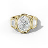 The Cleo features an oval center diamond with trapezoid side stones set in a secure bezel setting. This design balances classic elegance with modern craftsmanship, offering both brilliance and timeless appeal.