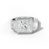 The Cleo features a princess-cut diamond center stone with trapezoid side stones, all secured in protective bezel settings. This three-stone design delivers both elegance and durability, making it a sophisticated choice for an engagement ring.