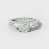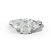 The Elsa engagement ring presents an elongated cushion-cut diamond as its stunning focal point, complemented by round side diamonds in an elegant three-stone setting. The four-prong mounting secures your center stone while maintaining an open, refined aesthetic that maximizes light performance.