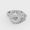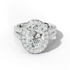 The Hailey Engagement Ring features a brilliant oval center diamond framed by a pave-set halo and complemented by side stones on a split shank band. This expertly crafted design enhances the diamond's sparkle while offering a timeless elegance that highlights the beauty and brilliance of the center stone. Ideal for those seeking a sophisticated and striking engagement ring.