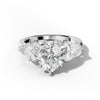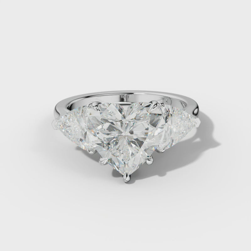 The Ivy Heart Cut Engagement Ring showcases a stunning three-stone design with a beautifully crafted heart-shaped center stone, symbolizing love and commitment. Flanked by trilliant cut side stones, this ring combines classic elegance with a modern twist, enhancing sparkle and visual appeal.