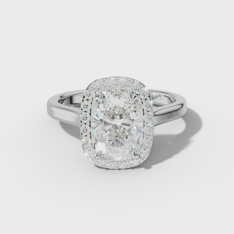 The Josephine Elongated Cushion Cut Engagement Ring showcases a stunning elongated cushion cut gemstone, expertly framed by a halo setting that amplifies its brilliance. Crafted with a cathedral setting, the ring offers superior elegance and structural integrity, elegantly lifting the center stone to catch the light from every angle. This expertly designed piece balances timeless design with contemporary appeal, making it an exceptional choice for a meaningful engagement.