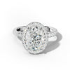 The Julia Engagement Ring showcases a stunning oval-cut diamond as its centerpiece, complemented by a sophisticated U-shaped pavé halo and delicate side stone accents. This design combines classic elegance with contemporary flair, allowing the oval diamond to command attention while the surrounding stones enhance its brilliance and create a luminous frame. The pavé setting ensures secure stone placement and adds refined sparkle throughout the band.