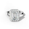 The Lila Engagement Ring features a striking emerald-cut center stone framed by a pave-set halo and secure prongs, enhancing its brilliance and elegance. This expert design emphasizes clean lines and timeless sophistication, making it an exquisite choice for those seeking a refined and dazzling symbol of commitment.