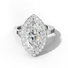 Elevate your proposal with the Lila Engagement Ring, showcasing a striking marquise-cut center stone for a timeless silhouette. The pave-set halo and prongs amplify brilliance, adding intricate sparkle and enhancing the ring’s elegant profile. Expertly crafted to highlight exquisite detail, this ring balances sophistication with a modern touch, perfect for celebrating your unique commitment.