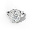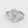 The Lila Engagement Ring showcases a stunning oval-cut diamond, accentuated by a delicate pave-set halo and secure prongs. This expertly crafted design enhances the center stone's brilliance and offers enduring elegance, making it an exceptional symbol of commitment.