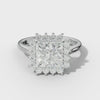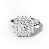 The Lillian Princess Cut Engagement Ring presents a masterfully designed floral halo that complements a sharp, angular princess cut diamond with refined elegance. Anchored by a cathedral setting, the band rises gracefully to showcase the center stone while botanical-inspired flourishes encircle it with intricate detail. This sophisticated composition merges the crisp geometry of princess faceting with delicate floral ornamentation, delivering a distinctive engagement ring for those who appreciate both structural precision and romantic embellishment in fine jewelry.