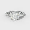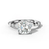 The Rosie Cushion Diamond Engagement Ring features a stunning cushion-cut center diamond, elegantly complemented by four prong-set side stones. This expertly crafted design highlights the brilliance of each diamond, offering exceptional sparkle and timeless sophistication.