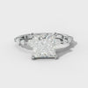 This Rosie Princess Cut Engagement Ring features a meticulously crafted princess cut center stone, secured with four elegant prongs to maximize brilliance and security. Flanked by carefully selected side stones, this design enhances the central gem's sparkle, creating a sophisticated and balanced look.