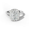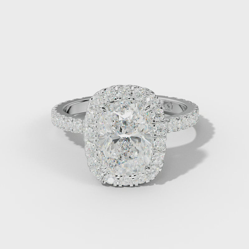 The Sadie Engagement Ring features a beautifully elongated cushion-cut center stone framed by a pave-set halo that enhances its radiant glow. Pave-set side stones and additional stones beneath the setting add depth and continuous sparkle, reflecting expert craftsmanship. This ring offers refined elegance and exceptional brilliance from every angle, perfect for those seeking a sophisticated and timeless engagement piece.