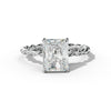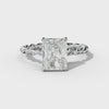 This radiant diamond engagement ring showcases a solitary stone in a four-claw prong setting, a configuration prized for its structural integrity and understated elegance. The four-claw design minimizes metal coverage while maximizing stability, allowing the diamond's natural beauty to dominate the composition.