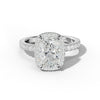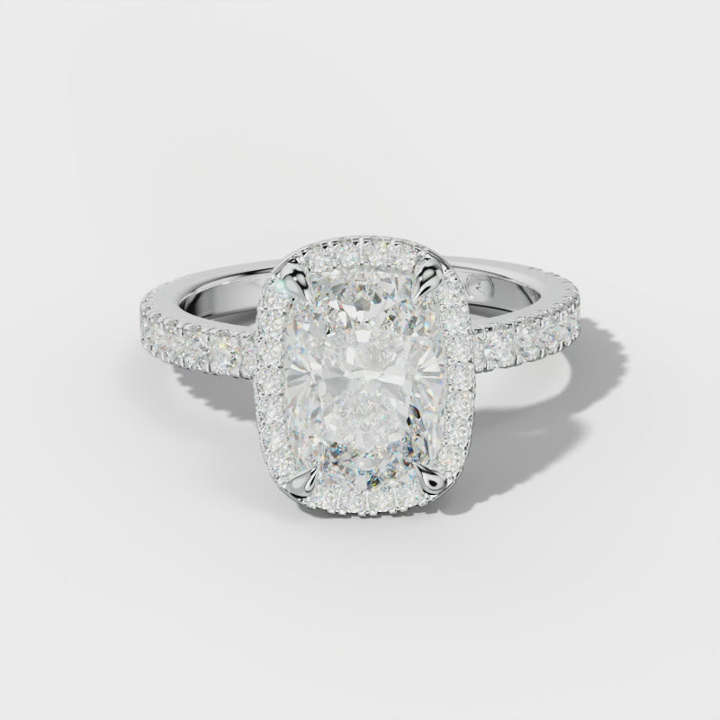 The Violet engagement ring showcases an elongated cushion-cut center stone, elegantly framed by a pave set halo that enhances its brilliance. Delicate pave set accent stones along the band add subtle sparkle, creating a refined and timeless look. Expertly crafted to highlight the center gem, this design offers a perfect balance of sophistication and elegance for a memorable symbol of commitment.